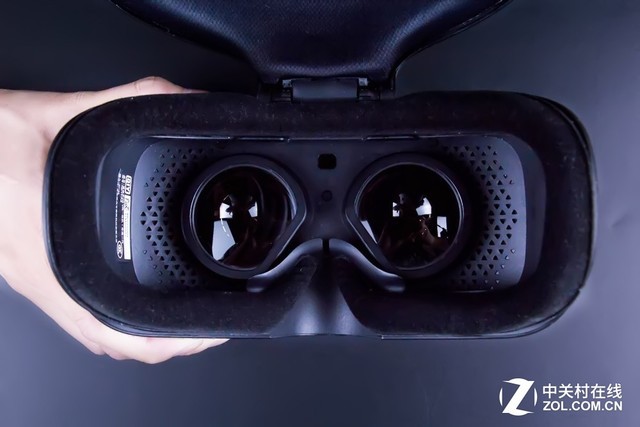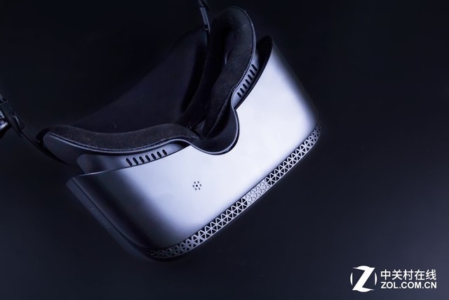 頭顯的背面則是目鏡區(qū)域。目鏡區(qū)域與人臉相接處有泡棉,可保護(hù)眼眶。目鏡本身則為雙非球面鏡片,成像清晰,擁有超大視場角,且不容易產(chǎn)生光暈。目鏡中央為接近傳感器,兩側(cè)擇有三角形紋理用于裝飾。
