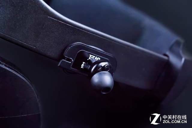 iQUT未來影院的頭箍非常寬大,額頭和后腦勺部位均有泡棉,可保證頭箍與頭部的切合度,也可以提升佩戴體驗。頭箍大小的調(diào)節(jié)則是通過后腦勺部位的滾輪實現(xiàn)的。在頭箍的左右兩側(cè),設(shè)有磁吸式有線耳機(jī),不用的時候可以盤起。