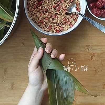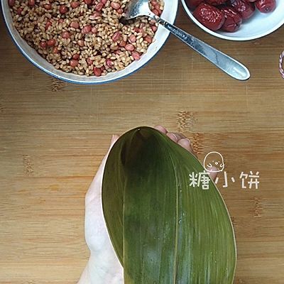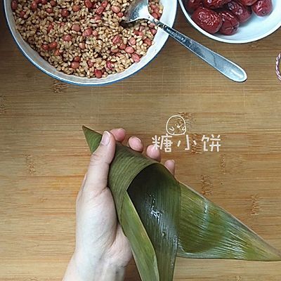 5、取一片處理好的粽葉,彎成一個錐筒形