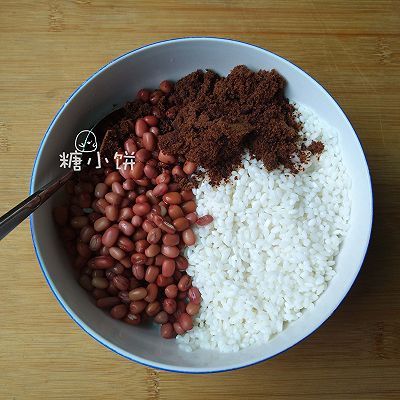 4、浸泡好的紅豆和糯米瀝干凈多余水分,加紅糖2湯匙和白砂糖1湯匙拌勻成米料備用。