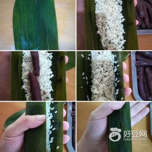 1、糯米淘洗干凈瀝去水分,米粽葉或竹葉洗凈備用.(沒圖片,因為和大的枕頭粽葉一起清洗的就忘記拍了。)
