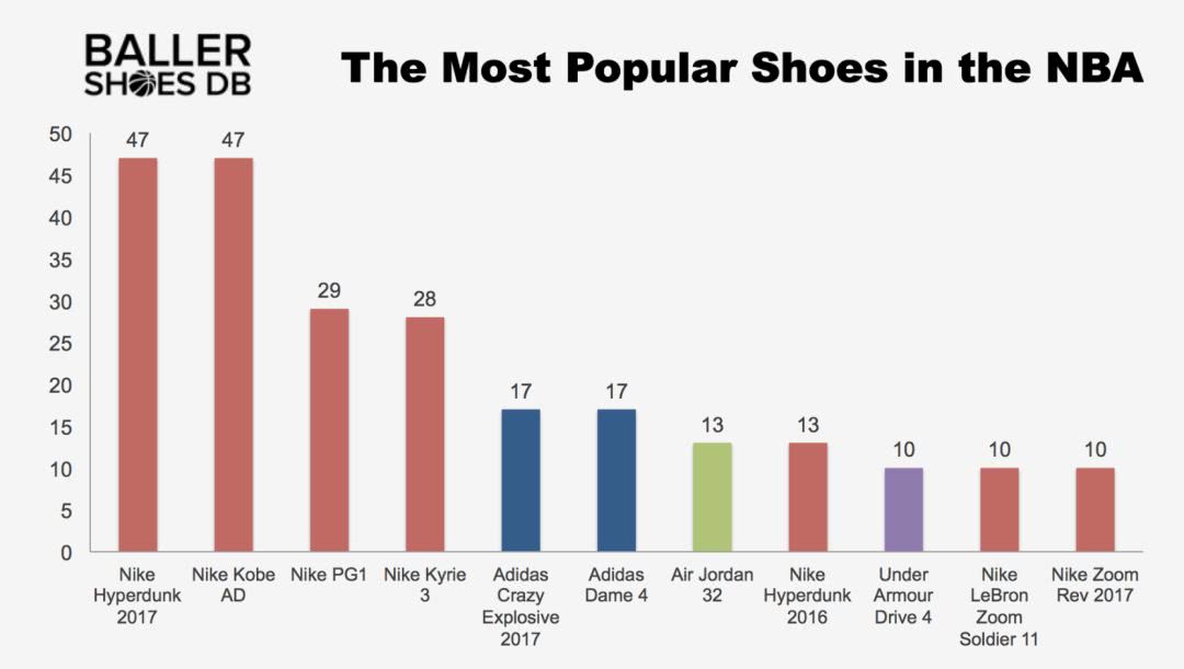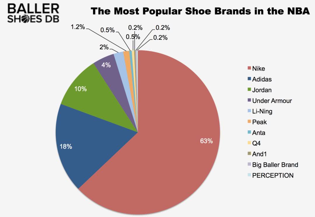 上賽季 NBA 的一份調(diào)查統(tǒng)計(jì)表明,耐克、阿迪達(dá)斯基本包攬了最受球員歡迎的鞋類,只有安德瑪在 NBA 賽場(chǎng)上維持著一定的曝光度。