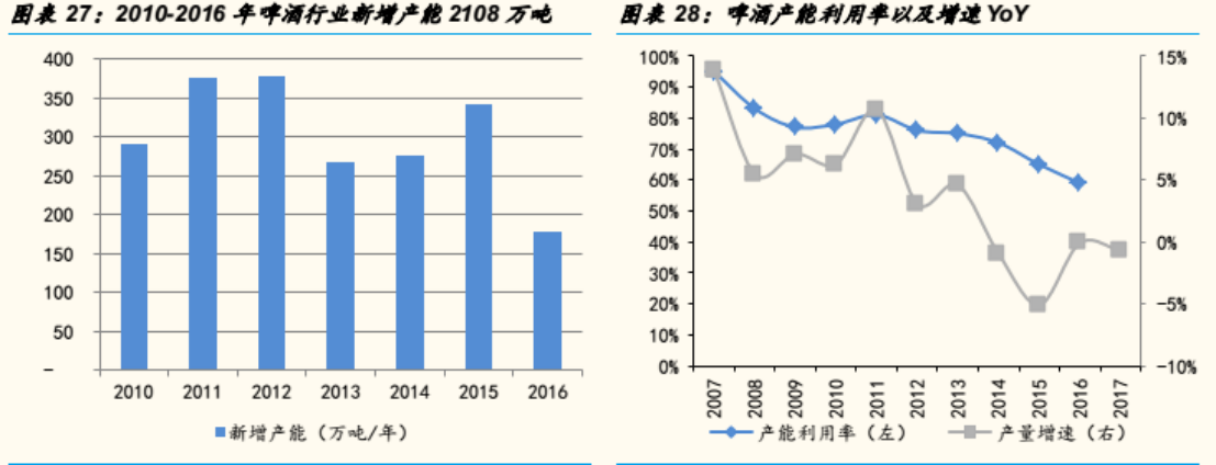 另有數(shù)據(jù)顯示,2010年至2016年,中國啤酒業(yè)供給擴(kuò)產(chǎn)超過2000萬千升,但同期銷量僅增加23萬千升。國家統(tǒng)計(jì)局?jǐn)?shù)據(jù)顯示,2016年啤酒行業(yè)行業(yè)綜合產(chǎn)能利用率僅為59%,較2011年的82%的產(chǎn)能利用率有明顯下滑。