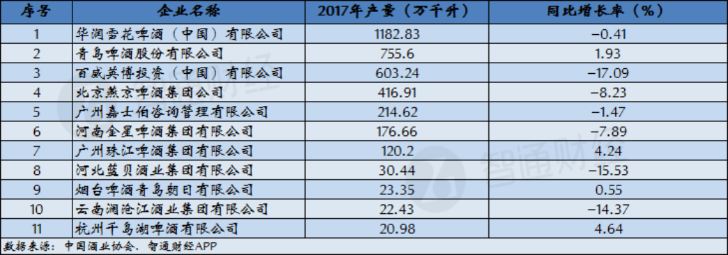 2017年,全國11家產(chǎn)量在20萬千升以上的11家啤酒企業(yè)中,有7家出現(xiàn)負(fù)增長,降幅超過10%的達(dá)到3家。全國20萬千升以上啤酒企業(yè)總產(chǎn)量3567.28萬千升,占全國總產(chǎn)量4401.49萬千升的81.05%較2016年的82.97%下降1.92個(gè)百分點(diǎn)。