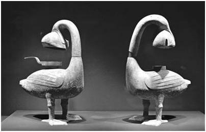 雁魚燈由雁首頸、雁體、燈盤、燈罩四部分套合而成,燈罩設(shè)計為兩片弧形板,可左右 轉(zhuǎn)動開合,既能擋風,又可調(diào)節(jié)燈光亮度。魚和大雁的身體都是空心的,點燃燈油或白蠟后產(chǎn)生的油煙被燈罩擋住,不能亂飛,只能向上進入雁和魚的體內(nèi)。