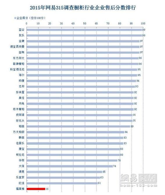 3月2日,網(wǎng)易家居“315家居企業(yè)售后服務(wù)調(diào)查”報(bào)告正式出爐。在29個(gè)被調(diào)查的櫥柜品牌中,我樂(lè)廚柜以總分99排名第一。