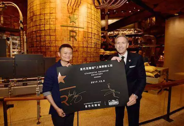 2017 年 12 月 5 日,星巴克位于上海靜安區(qū)的烘焙工坊開業(yè),這是星巴克全球最大的咖啡夢工廠,星巴克董事會執(zhí)行主席霍華德?舒爾茨親自出席了開幕儀式,而且邀請到了重量級的嘉賓――阿里巴巴執(zhí)行主席馬云。