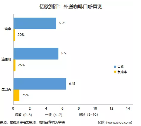 測(cè)評(píng)結(jié)果顯示,星巴克平均分最高,為6.45分,75%的體驗(yàn)者愿意再次購買;瑞幸平均分最低,為5.25分,只有20%的體驗(yàn)者表示愿意再次購買。具體到單品,星巴克熱拿鐵得分最高,瑞幸冰拿鐵得分最低。值得注意的是,測(cè)評(píng)中所有咖啡口感得分都在8分以下,評(píng)價(jià)均為一般,可見外送在一定程度上確實(shí)會(huì)影響咖啡的口感。