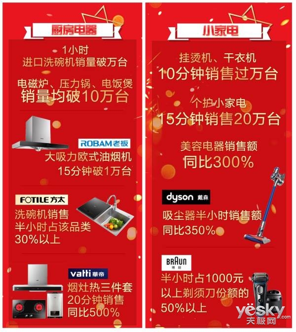廚房電器銷(xiāo)售榜中,老板大吸力歐式油煙機(jī)單型號(hào)15分鐘破萬(wàn)臺(tái),華帝煙灶熱三件套裝20分鐘銷(xiāo)售同比500%。1小時(shí)內(nèi),電磁爐、壓力鍋、電飯煲均破十萬(wàn)臺(tái)。衣物護(hù)理類(lèi)(掛燙機(jī)、干衣機(jī))10分鐘銷(xiāo)售過(guò)萬(wàn)臺(tái),全進(jìn)口高端洗碗機(jī)1小時(shí)銷(xiāo)售超萬(wàn)臺(tái),兩大品類(lèi)均刷新紀(jì)錄。而以全線(xiàn)擊穿歷史最低價(jià)出擊的方太洗碗機(jī),半小時(shí)銷(xiāo)售占洗碗機(jī)品類(lèi)的30%以上,以“黑科技”形象受到追捧的高端戴森吸塵器半小時(shí)銷(xiāo)售額同比350%。而個(gè)護(hù)小家電15分鐘就銷(xiāo)售了20萬(wàn)臺(tái),也是本次年中購(gòu)物節(jié)中的一大看點(diǎn)。