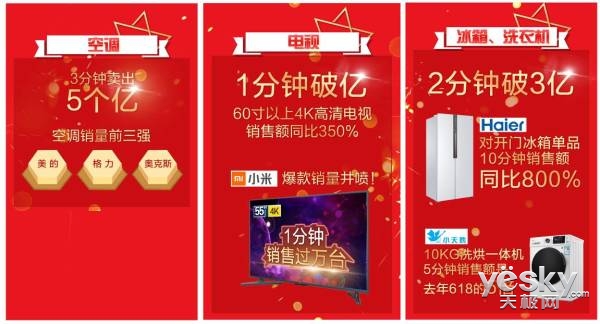 在各品類(lèi)銷(xiāo)售中,空調(diào)成為最熱銷(xiāo)品類(lèi),3分鐘銷(xiāo)售額突破5億元。奧克斯、美的、格力三大品牌競(jìng)爭(zhēng)激烈;得益于世界杯效應(yīng),電視品類(lèi)在1分鐘內(nèi)破億。互聯(lián)網(wǎng)品牌小米成為最大贏家,55英寸小米爆品1分鐘即銷(xiāo)售過(guò)萬(wàn)臺(tái)。值得關(guān)注的是,自6月1日啟動(dòng)618全球年中購(gòu)物節(jié)后,4K超高清+60英寸以上大屏電視的銷(xiāo)售額已達(dá)到去年同期的350%。