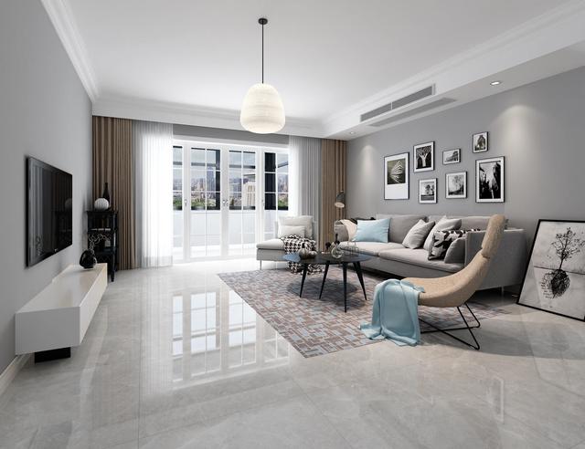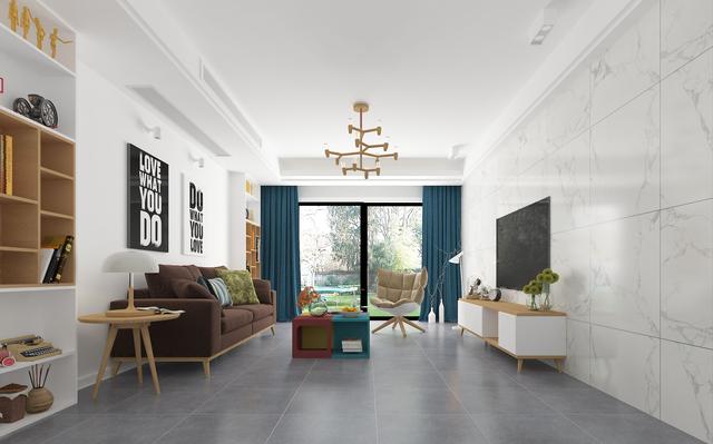 首先是客廳,客廳是我們最主要的活動區(qū)間,不宜過于壓抑,采用維納斯灰作為地磚鋪設(shè),淺灰色和白色紋理給人的感覺比較清雅,但又不會覺得苦悶,墻面以月光白鋪貼,使整體顯得更為簡潔明亮。