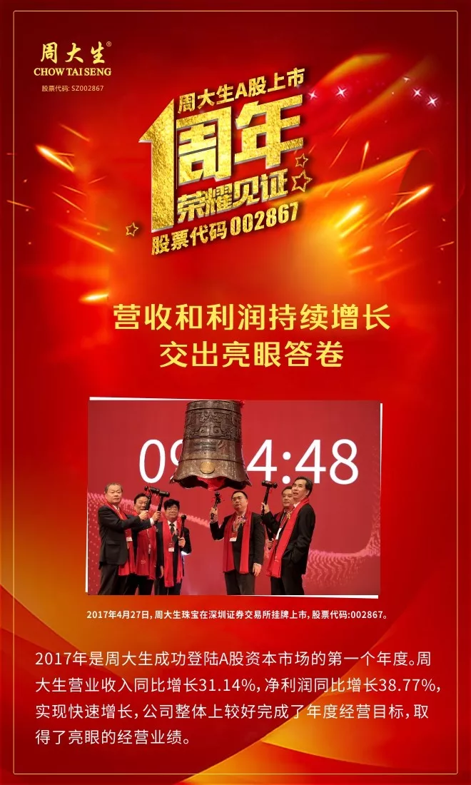 2017年4月27日,周大生(股票代碼002867)在深圳證券交易所A股上市。2018年4月17日,周大生發(fā)布2017年年報,全年實(shí)現(xiàn)營業(yè)收入38.05億元,同比增長31.14%,歸屬于上市公司股東的凈利潤5.92億元,同比增長38.77%。