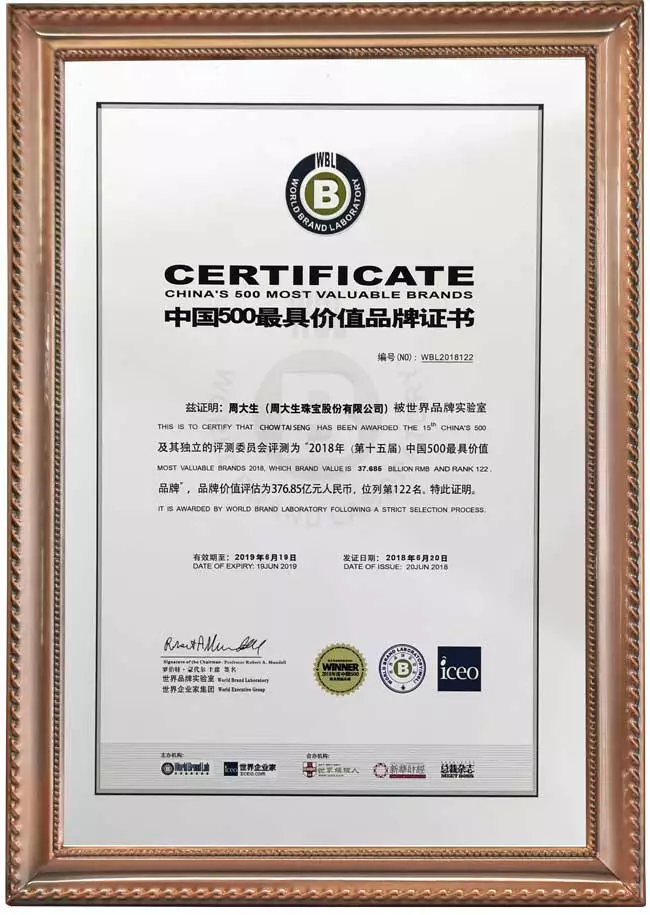 周大生連續(xù)第8年蟬聯(lián)《中國500最具價值品牌》,位列第122名