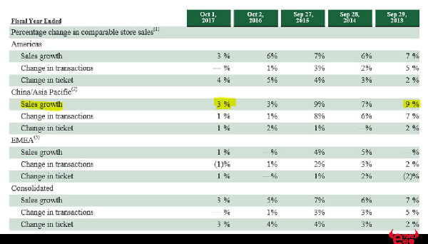 但是,星巴克的銷售增長逐漸疲軟,根據(jù)2017年的財報,星巴克在中國的銷售額從13年的9%的增長降到3%,其他地區(qū)也不容樂觀,這不是快速擴張的門店所應(yīng)該帶來的結(jié)果。