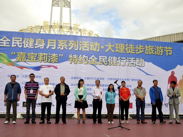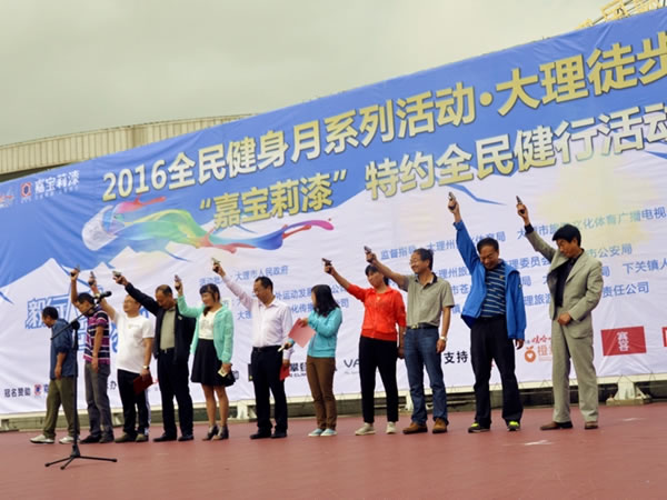 2016年8月6日7:00第31屆夏季奧林匹克運(yùn)動(dòng)會(huì)開幕式在巴西里約熱內(nèi)盧馬拉卡納體育場舉行,在同一時(shí)間“2016大理徒步旅游節(jié)——嘉寶莉特約全民健身活動(dòng)”在美麗的蒼山洱海邊拉開帷幕。大理市人民政府副市長劉占華、嘉寶莉集團(tuán)家裝漆事業(yè)部運(yùn)營總監(jiān)謝錦州出席開幕式并致辭。大理州文化體育廣播局局長王崢榮宣布開幕,大理市旅游度假區(qū)紀(jì)委書記、大理市旅游文化體育廣播電視局局長周麗玲主持當(dāng)天的開幕式。