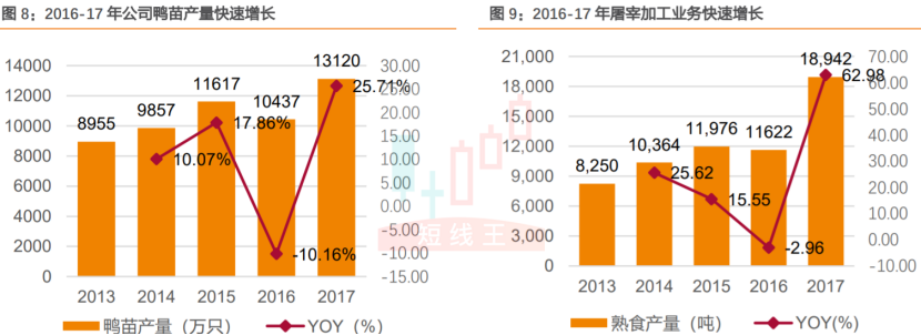 1)養(yǎng)殖:預計18年公司鴨苗生產(chǎn)2億羽,其中外銷1億羽,屠宰9000萬羽。預計鴨苗養(yǎng)殖完全成本2.7元/羽左右;
