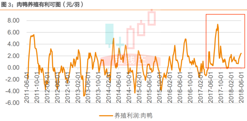 ①2017年以來環(huán)保產(chǎn)能去化超20%,肉鴨行業(yè)已進入景氣階段!2018年全年白羽肉鴨出欄有望從25-30億羽下降到20-25億羽。環(huán)保收緊,疊加上輪周期產(chǎn)業(yè)虧損養(yǎng)殖戶退出,此輪周期產(chǎn)能下降明顯。