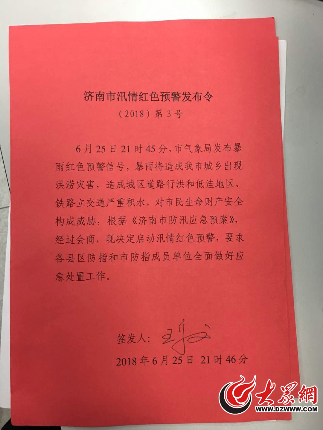 \u00A0\u00A0\u00A0 大眾網(wǎng)濟南6月25日訊 記者從濟南市防汛辦獲悉,6月25日21時45分,市氣象局發(fā)布暴雨紅色預警信號,暴雨將造成濟南市城鄉(xiāng)出現(xiàn)洪澇災害,造成城區(qū)道路行洪和低洼地區(qū)、鐵路立交道嚴重積水,對市民生命財產(chǎn)安全構成威脅,根據(jù)《濟南市防汛應急預案》,經(jīng)過會商,啟動汛情紅色預警,要求各縣區(qū)防指和市防指成員單位全面做好應急處置工作。據(jù)介紹,這是編制和實施《濟南市防汛應急預案》以來,濟南市防在全市范圍內(nèi)首次發(fā)布紅色預警。