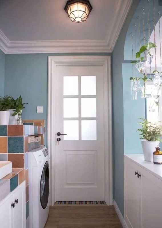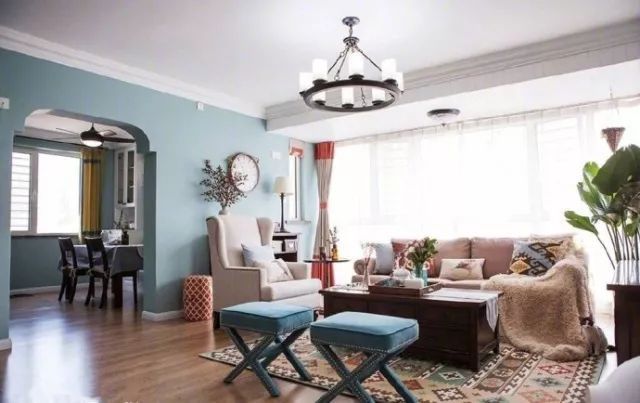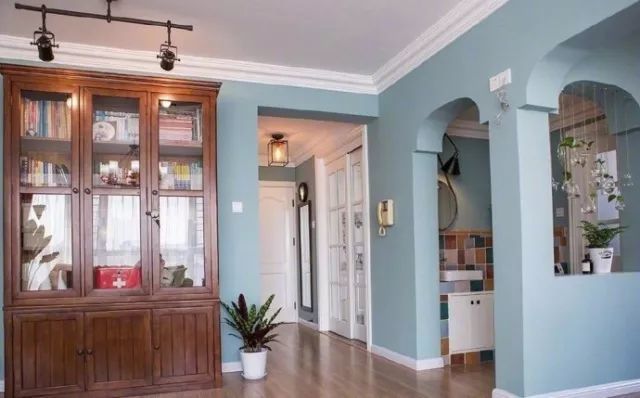 客廳選擇了飽和度較低的藍(lán)色來作為墻面的顏色,給人一種清涼冷靜的感覺。軟飾方面選擇了復(fù)古的中式茶幾和米色的布藝沙發(fā),溫馨舒適。