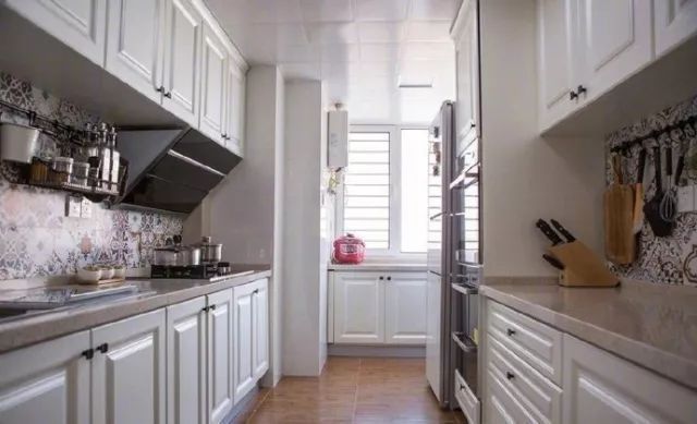 廚房采用的是二字型櫥柜,分列在兩面平行墻邊的櫥柜,中間用于活動和操作,是烹飪效率極高的櫥柜形式,兩個轉(zhuǎn)身就能到達(dá)的工作臺對于做飯是十分方便、寬敞的,使用起來會感覺非常人性化。