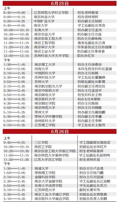 6月25、26日南京大學(xué)、東南大學(xué)、南京師范大學(xué)等39所高校招生專家將陸續(xù)亮相揚(yáng)子晚報(bào)招考部落2018“高招直播”,在線發(fā)布學(xué)校最新的招生政策,給出今年預(yù)估分?jǐn)?shù)線,并解答考生、家長(zhǎng)的提問(wèn)。 \u00A0 \u00A0