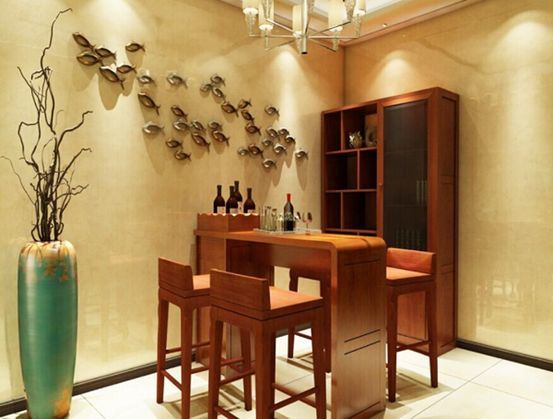 裝修成中式風(fēng)的吧臺(tái)更具一番韻味。木質(zhì)的吧臺(tái)和桌椅、柜子使整個(gè)空間的氣息沉穩(wěn)而不死板,恰恰與在木質(zhì)酒桶里釀造成的美酒更加相配!墻壁上點(diǎn)綴一群小魚兒,為增添了一絲活力,也給人一種飲酒似游魚快活的感覺。