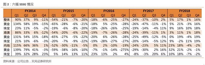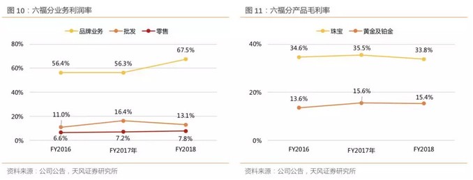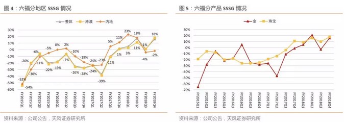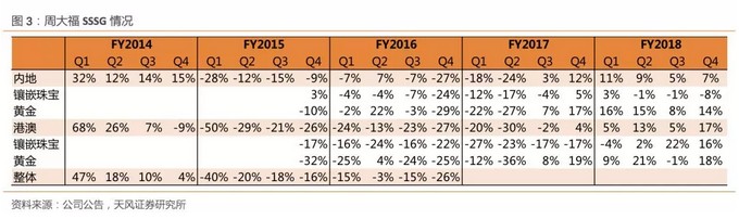 預計公司三四線城市的加速布局,將進一步享受由消費升級帶來的巨大市場。但目前內(nèi)地三四線珠寶市場呈現(xiàn)強競爭局面,公司面臨香港和大陸的多家珠寶商對手,且各品牌產(chǎn)品及名字之間差異化較小,未來市場份額擴張或?qū)⒊袎骸Y18三線以下同店銷售增長3%,下半財年因公司不愿過多降價壓低毛利率,促銷力度不及同行,銷售較上半財年同店銷售增長20%有所放緩。