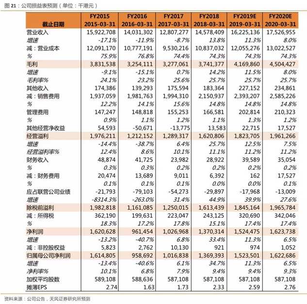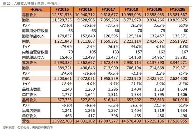 仍然看好六福的中高端港資品牌定位以及內(nèi)地渠道下沉的店鋪布局,伴隨下半年廣深港高鐵開通,預計FY19公司港澳地區(qū)將取得雙位數(shù)增幅,在內(nèi)地市場實現(xiàn)單位數(shù)增幅。但赴韓游或?qū)⒎至鞲案勐每停夜緝?nèi)地市場發(fā)展承壓,再加上當前P/E 13.1x,雖與龍頭周大福相比較低,但相對內(nèi)地老鳳祥而言并無過多估值優(yōu)勢。下調(diào)公司目標價至35港元,根據(jù)預期公司FY2019 EPS2.6港元,對應P/E 13.5x,下調(diào)至“增持”評級。