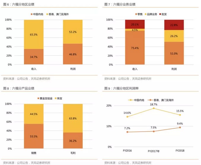黃金仍是公司最受歡迎產(chǎn)品,黃金及鉑金銷售同比增10%至77億港元,占比56%,毛利率15%保持平穩(wěn)。珠寶首飾銷售同比增17%至62億港元,毛利率因公司下調(diào)珠寶首飾批發(fā)價格以應對市場競爭而降1.7%至33.8%。港澳珠寶ASP同比分別降40%和14%至2800港元和5700澳門元,內(nèi)地ASP 3000元與去年持平。分業(yè)務來看,零售收入同比增14%至110億港元,占比75%。因品牌店數(shù)目增加,批發(fā)業(yè)務收入同比增9.6%至29億港元,占比20%;品牌業(yè)務收入同比增27%至6.5億港元,占比5%。