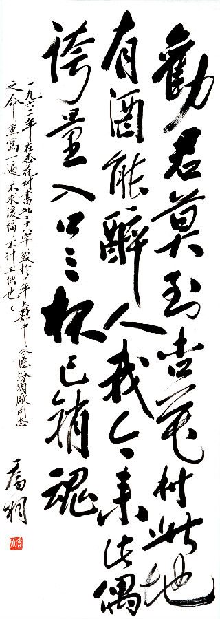在主人的盛情之下,喬羽把酒臨風(fēng),一連飲下幾大杯,豪情奔放,興致大發(fā),索要筆墨紙硯,揮毫?xí)鴮憽V灰婁佌沟陌仔下淠尚校骸皠窬叫踊ù濉眹^的人頓時(shí)傻了眼,喬羽卻不慌不忙,然后沉穩(wěn)地落下筆:“此地有酒能醉人……”不等人們醒過神來,那只如椽之筆龍蛇飛舞,一瀉而下:“我今來此偶夸量,入口三杯已銷魂。”