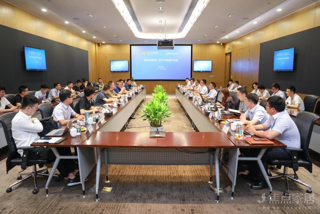 6月25日,蘇寧易購(gòu)“萬(wàn)人搶廚衛(wèi)”活動(dòng)爆發(fā)前一天,美的集團(tuán)廚房和熱水事業(yè)部總經(jīng)理徐旻鋒攜核心團(tuán)隊(duì)到訪蘇寧,與蘇寧易購(gòu)總裁侯恩龍、蘇寧零售集團(tuán)廚衛(wèi)家裝公司總裁助理柳賽對(duì)年中總結(jié)和下半年度戰(zhàn)略進(jìn)行了規(guī)劃。