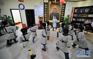 12月7日,湖南長沙金源童學館的孩子們在課間打童學拳。穿漢服,拜孔子,誦國韻,習禮儀。近日,一家以傳統(tǒng)國學文化啟蒙為主要課程的童學館——長沙金源童學館開館授課。一群12歲以下的孩子利用周末時間,來這里學習德行、數(shù)理、國藝、詩文、武術等,感受中華國學文化的魅力。新華社記者 李尕 攝