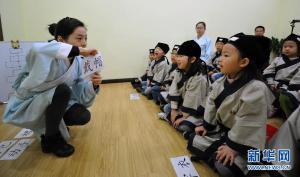 12月7日,湖南長沙金源童學館的老師在課堂上和孩子進行漢字記憶游戲。穿漢服,拜孔子,誦國韻,習禮儀。近日,一家以傳統(tǒng)國學文化啟蒙為主要課程的童學館——長沙金源童學館開館授課。一群12歲以下的孩子利用周末時間,來這里學習德行、數(shù)理、國藝、詩文、武術等,感受中華國學文化的魅力。新華社記者 李尕 攝