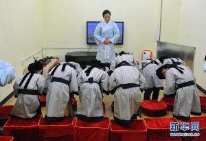 12月7日,湖南長沙金源童學館的孩子們上課前向老師行禮。穿漢服,拜孔子,誦國韻,習禮儀。近日,一家以傳統(tǒng)國學文化啟蒙為主要課程的童學館——長沙金源童學館開館授課。一群12歲以下的孩子利用周末時間,來這里學習德行、數(shù)理、國藝、詩文、武術等,感受中華國學文化的魅力。新華社記者 李尕 攝