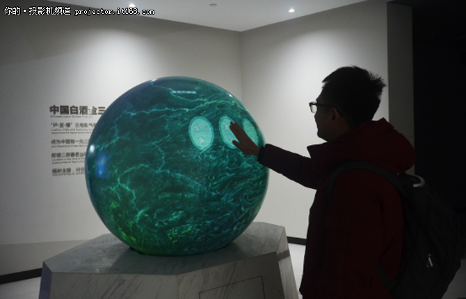移步向前,來到交互投影球方案旁,它介紹了中國白酒金三角“瀘-宜-遵”,郎酒二郎醬香基地、瀘州濃香基地都位于核心區(qū)域,兩翼齊飛,輻射全國,向世界進(jìn)發(fā)。此方案應(yīng)用了1臺索尼VPL-F435HZL激光工程投影機,可用手劃動球形地圖,并觸控界面播放詳細(xì)資料。