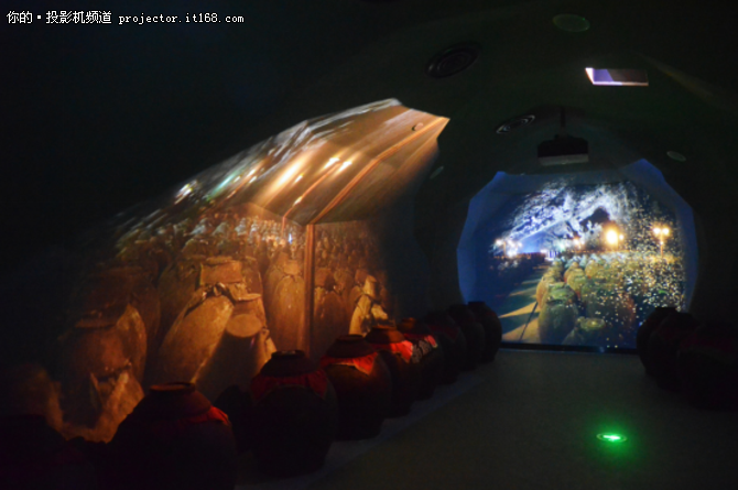 穿過“廊道”,接下來的“洞藏”是一個逼真的藏酒環(huán)境,神秘暗沉孕育著香醇美酒,這本身就充滿詩意。此展項應(yīng)用了3臺索尼VPL-F435HZL激光工程投影機,在不規(guī)則的“巖壁”上投影洞內(nèi)實景,延展整個空間,讓人身臨其境,我們仿佛面對成千上萬古樸酒壇,每一個都蘊藏著悠久歷史,引人遐想。