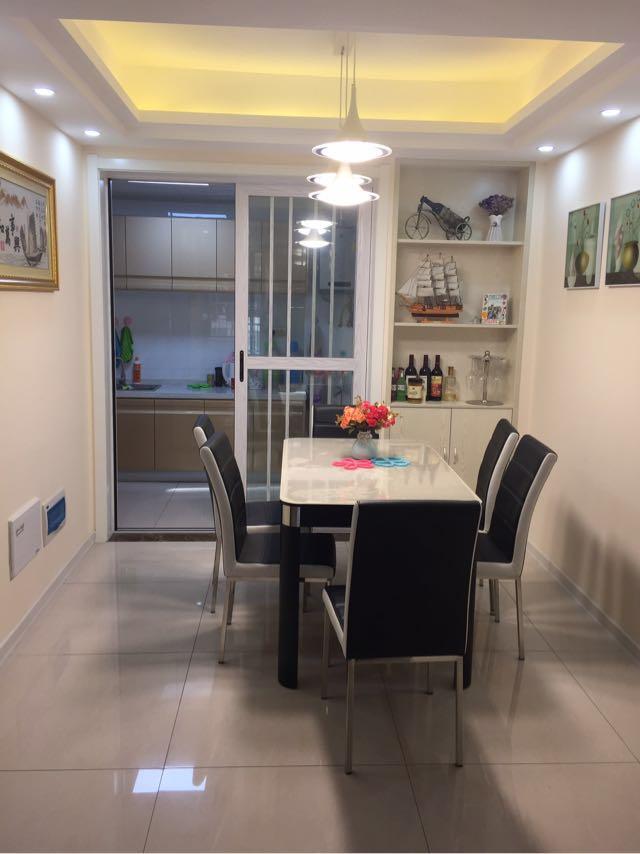 餐廳的吊頂也是方形的,這種暖黃色的燈帶很有氛圍餐廳的桌椅都擺上了,跟廚房隔了推拉門,還留出一部分做了餐柜。