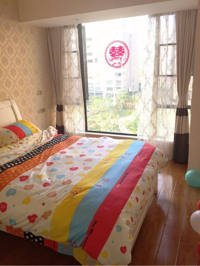 這是臥室部分,墻上也有貼壁紙,雖然沒有飄窗但是窗戶也夠大,采光也是很不錯(cuò)的。臥室的床比較小,也是白色的床,不過是木質(zhì)的,床上用品都是我選的,清新美麗非常贊。