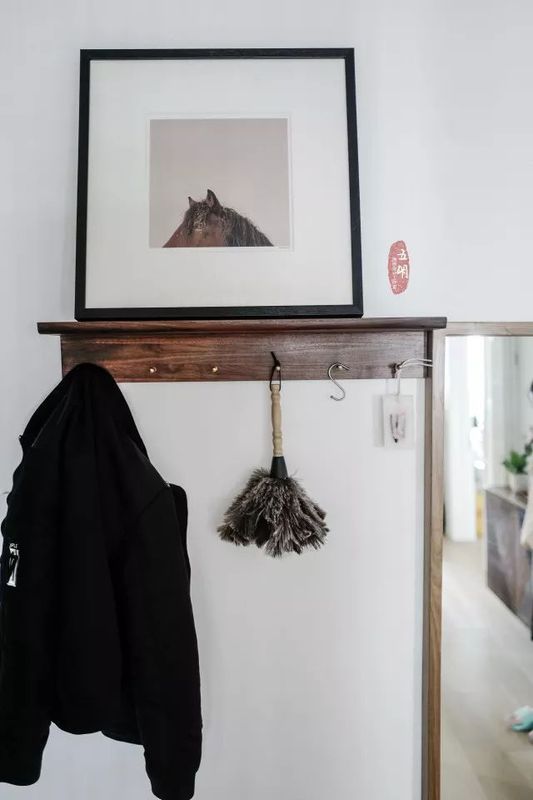 玄關另一側(cè)墻壁用來隨手掛放衣物和穿衣鏡,一張貓咪裝飾畫,頓時讓玄關“喵”趣橫生。