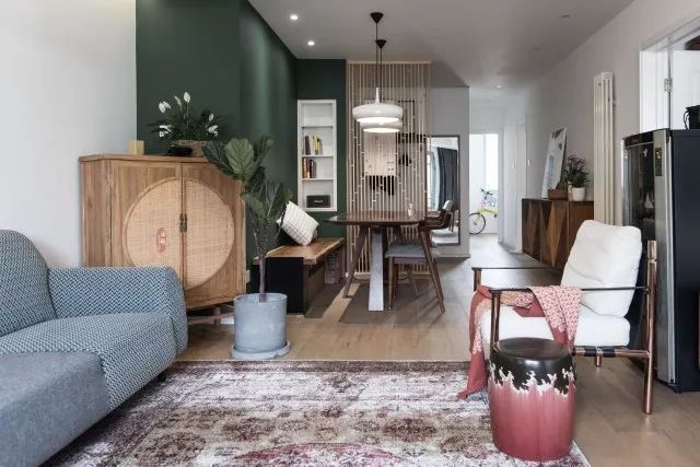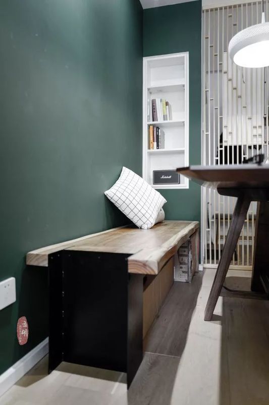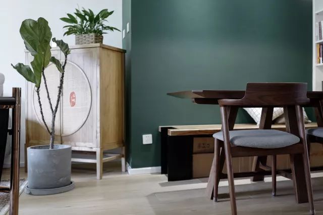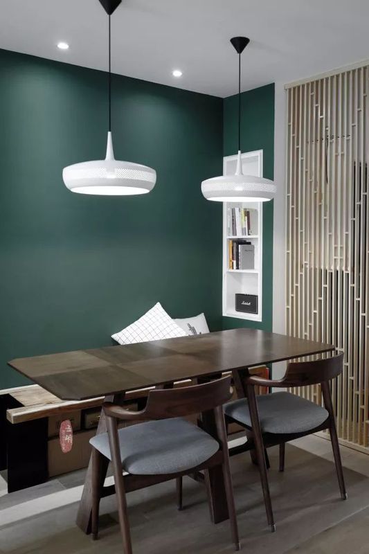 餐廳的墨綠色背景墻有一種高貴復古的氣息,兩代人的審美都可以得到滿足。
