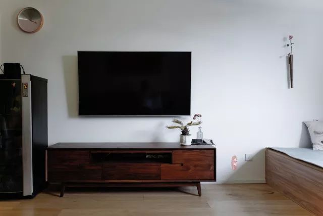 復古的電視柜,擺上兩盆綠植,流露出了中式的禪意。