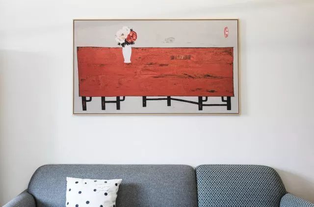 簡約的灰藍色沙發(fā)敦厚低調(diào),為了和餐廳的墨綠色背景墻墻制造點呼應,特意選了一款大面積暗紅色的裝飾畫。