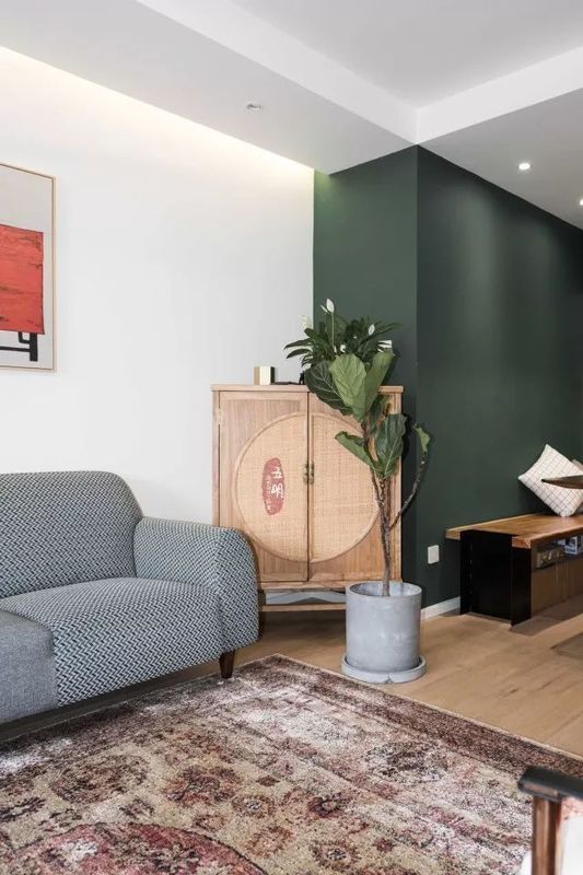 客廳一角擺放一個古典小立柜,原木色的質(zhì)樸襯托著兩盆綠植高低呼應,客廳立刻就有了淡雅的新中式味道。