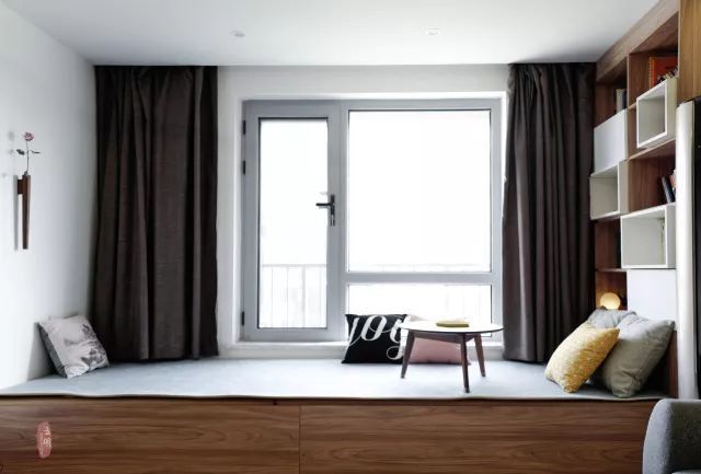收納型的飄窗設計,墻上打造成書柜,坐在飄窗上,靜靜的讀一本書,也是很愜意的。