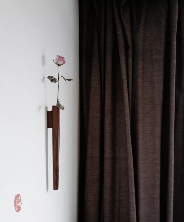 在一側(cè)墻壁上插一支淡粉色的花,一處簡單的小景,看似不經(jīng)意,卻有著動人的美。