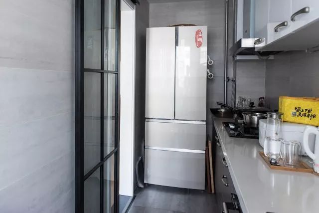 玻璃移門節(jié)約空間又通透,保證采光。廚房臺面直通到陽臺,烤箱洗碗機內(nèi)嵌,白色臺面整潔大氣又好打理。