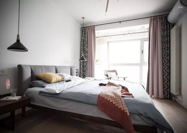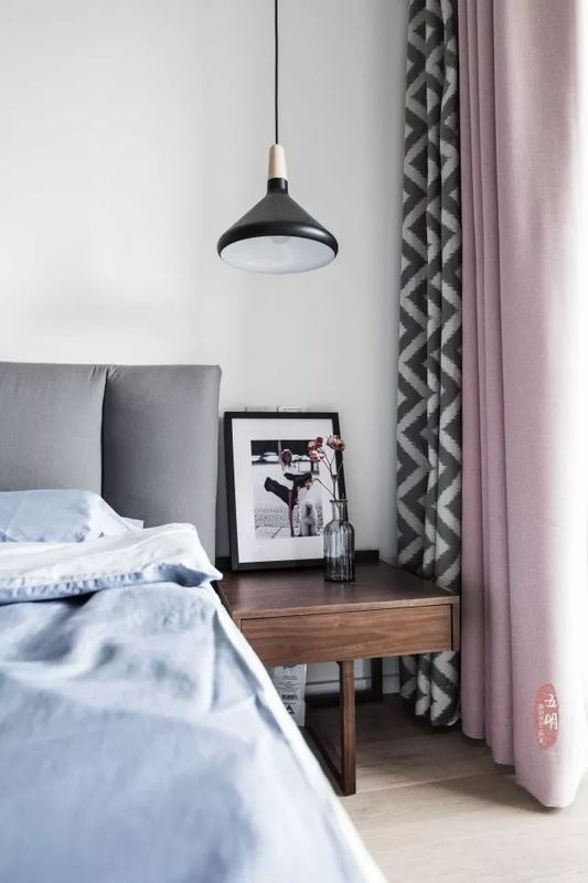 床頭柜設計簡約別致,選用吊燈作為床頭燈既節(jié)省空間,也成為床頭別致的小景。