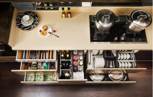 Magic Q針對(duì)吊柜、地柜、高柜、電器柜、墻面等形成了13個(gè)專業(yè)櫥柜規(guī)劃,大到電器、鍋具、小到餐具、刀具、碗碟等超過18類廚房用品,都有專門的的收納方案,每一件廚房用品都各得其所,讓廚房井然有序。
