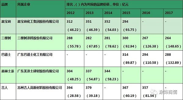 2012—2017年度“中國(guó)500最具價(jià)值品牌”(涂料企業(yè))