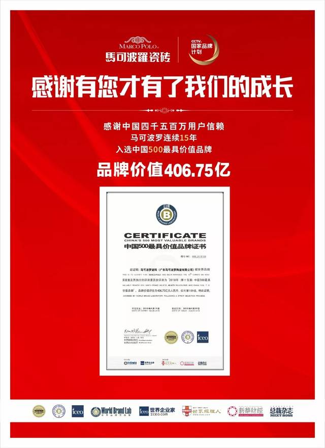 百舸爭流千帆竟,乘風(fēng)破浪正遠航。馬可波羅瓷磚的品牌價值再創(chuàng)新高,既是實力的見證,更預(yù)示著未來發(fā)展的無限潛能!全新的奮斗征程已經(jīng)開啟,馬可波羅瓷磚必將肩負起“品牌大國”崛起的光榮使命,為建設(shè)美麗中國添磚加瓦,讓世界再愛上中國陶瓷!
